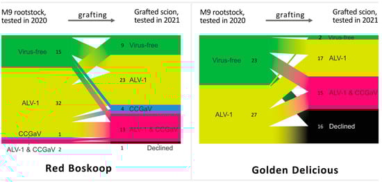 One hundred commercially purchased M9 rootstock accessions were used for budwood grafting (August 2020) of two HTS-tested virus- and viroid-free apple cultivars (Red Boskoop (RB), n = 50 and Golden Delicious (GD), n = 50) with the purpose of establishing a virus- and viroid-free orchard. Nevertheless, we found that some of the M9 rootstocks were infected with either ALV-1, CCGaV, or both agents (Table S1A-rootstocks). Thus, a year later (September 2021), scion leaves were sampled and screened for virus presence. Out of 100 grafted trees, 17 declined (16 GD and 1 RB), and 56 out of the remaining 83 scions were found to be virus-positive (Figure 9, Table S8).