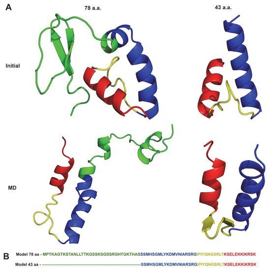 Secondary structure predictions performed with the PsiPred webserver [43] show that the first 35 residues of the full-length wt:p10 have no regular secondary structure arrangement (Figure S1). From residue 36 onward, this protein is predicted to have a helix-turn-helix motif, similar to what was reported in other DNA-binding proteins [44]. Both the 78- and 43-amino-acid (a.a.) wt:p10 models generated with the Robetta webserver (Figure 1A) consistently show the presence of this structural motif in the same sequence of a.a. Interestingly, in this motif, it is also possible to observe the existence of a small misalignment of the two helices, which seems to be stabilized by several hydrophobic a.a. residues. To evaluate the dynamic stability of the reported motif, we performed MD simulations with both models. As shown in the C-alpha RMSD plots (Figure S2A,B), in both models in all three replicate simulations, after 50 ns of simulations, the C-terminal region of both models reached an equilibrated conformational state, which we have represented with their central structure (Figure 1A) [32]. In the simulations with the 78 a.a. model, the helix-turn-helix motif was slightly lost when compared to the truncated 43 a.a. wt:p10 model. The high conformational variability of the N-terminal region of this protein (Figure S2B,C), contributes to the observed destabilization of the C-terminal wt:p10 structural helix-turn-helix motif. Interestingly, these observations were not noted in the 43 a.a. model simulations, suggesting that the helix-turn-helix motif of wt:p10 is structurally stable. This observation, and the respective conservation of the misalignment between the two helices, suggests that the C-terminal region of the protein may be important in the DNA-binding function of wt:p10, similarly to other proteins containing helix-turn-helix motifs [44].