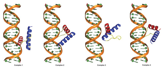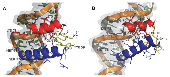 The contact surface area variation for each dsDNA/wt:p10 complex shows an increase over time for most simulations, more evident after an equilibration period (Figure 3). After 500 ns, the conformations adopted by the wt:p10 protein relative to the dsDNA in these systems have higher surface complementarity, suggesting the formation of stable complexes (Figure S3). Analyzing these results and looking at the representative structures of the complexes in equilibrium, we identified the most important structural features of wt:p10 driving the formation of these stable arrangements (Figure 4). In the representative structures of complexes 2 and 4, selected for their high contact surface area, the helix-turn-helix motif and the previously observed misalignment of the two wt:p10 helices are kept in the interaction with dsDNA. Additionally, in both models, the N-terminal helix of the wt:p10 protein (colored in blue) directly interacts with the major groove of the DNA, while the C-terminal helix (colored in red) adopts a similar interaction profile in the minor groove. Focusing specifically at the N-terminal helix of the wt:p10 protein models, we observe that the first five residues show a deeper insertion in the major groove of the dsDNA, while the remaining residues seem to be more solvent-exposed. These first residues of the 43 a.a wt:p10 model form a serine-rich motif, also observed in other DNA-binding proteins, to direct the interaction with DNA [8]. The unstructured loop connecting both helices does not seem to interact with dsDNA, despite the presence of some positively charged residues. These residues prefer to be in well-solvated positions, without contributing to the stabilization of the observed complexes. Furthermore, the C-terminal helix is partially embedded in the minor groove of the dsDNA, with a very good surface/shape complementarity. Although smaller (only composed of 12 residues), the positively charged residues found in this helix establish stable electrostatic interactions with the negatively charged region of the dsDNA phosphate backbone. Lys-72, 73, 75, 78, and Arg-76 are the residues providing close interactions with the minor groove of the dsDNA, contributing to the apparent stability of these complexes (Figure 4).