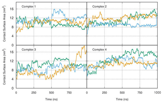 The contact surface area between wt:p10 and the dsDNA calculated for all MD simulations. Replicate 1, 2 and 3 from each simulated system is respectively colored in green, blue, and yellow.