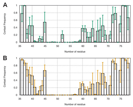 To identify the residues from wt:p10 that contribute the most to the complexes’ formation, we calculated the contact frequency per residue (Figure 5). On average, the first five residues of the N-terminal helix show a high number of contacts with the dsDNA. This agrees with the representative complex structure described in Figure 4, where Ser-36, Ser-37, Met-38, His-39, and Ser-40 were shown to be deeply inserted in the major groove of the dsDNA. Additionally, the final seven residues found in the wt:p10 C-terminal helix also establish a high number of contacts with the dsDNA. Correlating these observations with the representative configurations of the complexes (Figure 4), it becomes clear the important role of hydrogen bonds and ionic interactions between Lys-72, Lys-73, Lys-75, Arg-76, Ser-77, and Lys-78 and the phosphate backbone of the dsDNA delimiting the minor groove. Arg-76 is the residue more frequently interacting with the dsDNA, probably due to its side chain adopting a stable and persistent position embedded in the minor groove of the dsDNA (Figure 4). The arginine residue is particularly suitable for this role since, despite carrying a positive charge, it retains significant hydrophobicity in a planar group (guanidinium) to promote its side chain insertion deep into the dsDNA base pair region. The residues in the loop segment (60–69) also interact with the dsDNA, but these are less frequent and are probably transient in nature, due to the high flexibility of this wt:p10 region.