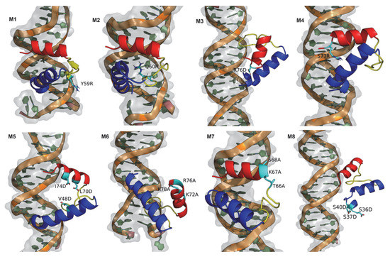 All designed mutants were built using the selection mutation python script from Modeller version 10.0 [39,40,41,42]. The last snapshot of one of the replicates of wt:p10 complexed to dsDNA MD simulations was used as a structural template to generate the desired mutations. The software considers this template to rebuild the coordinates of the original residues to match the desired target mutated amino acids.