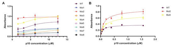 After purification, the concentration of p10 and its mutant derivatives was determined by a commercial kit, the Coomassie (Bradford) Protein Assay (Thermo Scientific, Waltham, MA, USA), using the microplate format procedure. Here, 5 µL of the mutant derivative was pipetted into a 96-well plate (Thermo Scientific, Waltham, MA, USA). Coomassie reagent was added (250 µL/well) and it was mixed for 30 s. The plate was incubated at room temperature for 10 min, and then the absorbance was read at 595 nm wavelength with a Microplate ELISA Reader (Biorad, Basel, Switzerland). A standard curve was prepared using a range of known BSA concentrations. This standard calibration curve was used to estimate p10 and mutant derivatives’ protein concentrations (µg/mL).