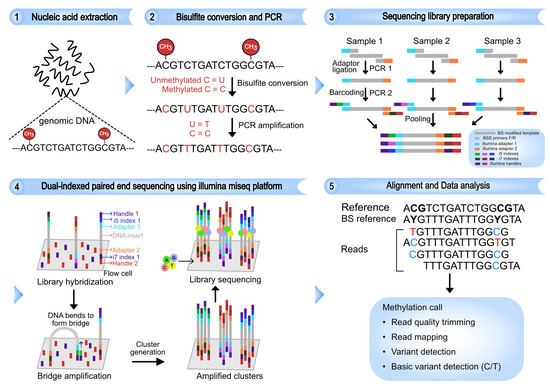 - Bashtrykov, P.; Jeltsch, A. DNA Methylation Analysis by Bisulfite Conversion Coupled to Double Multiplexed Amplicon-Based Next-Generation Sequencing (NGS). Methods Mol. Biol. 2018, 1767, 367–382. [Google Scholar] [CrossRef]