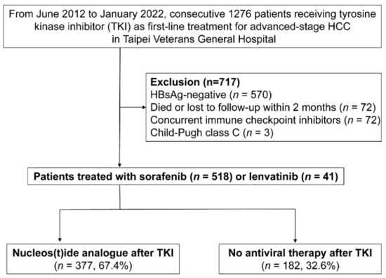 From June 2012 to January 2022, we retrospectively screened 1276 patients who received sorafenib or lenvatinib as first-line therapy for unresectable HBV-related HCC in Taipei Veterans General Hospital (Figure 1). Patients were included if they fulfilled the following criteria: (1) age ≥ 20 years; (2) diagnosis of HCC according to the criteria of the American Association for the Study of Liver Diseases (AASLD) guidelines []; and (3) Barcelona Clinic Liver Cancer (BCLC) stage C or stage B refractory to transarterial chemoembolization (TACE). The exclusion criteria were as follows: (1) HBsAg-negative (n = 570); (2) died or lost to follow-up within 2 months after starting (n = 72); (3) receiving concurrent immunotherapy during TKI therapy (n = 72); (4) Child–Pugh class C (n = 3).