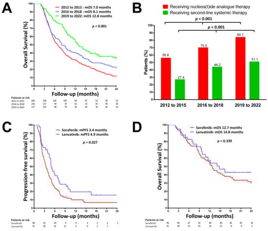 We classified patients into three different periods of starting TKI therapy: 2012–2015 (n = 266), 2016–2018 (n = 156), and 2019–2022 (n = 137). As shown in Figure 2A, the OS gradually improved after 7.0 months in patients who started TKI during 2012–2015 to 8.1 months during 2016–2018 and 12.7 months during 2019–2022 (p < 0.001). There was a significant trend in increased application of NUC therapy from 56.8% during 2012–2015, to 70.5% during 2016–2018, and to 84.7% during 2019–2022 (p < 0.001, Figure 2B). There was also a significant trend in increased application of second-line systemic therapy from 27.4% during 2012–2015, to 44.2% during 2016–2018, and to 51.1% during 2019–2022 (p < 0.001, Figure 2B).