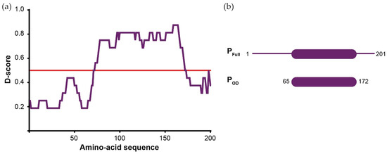 Predicted architecture of BoDV-1 phosphoprotein. (a) D-score (score for disorder as a function of residue) of BoDV-1 P. The prediction was based on 16 predictor web servers and the D-score was calculated by adding the values for each residue and dividing by the number of used algorithms. We arbitrarily defined a threshold level at 0.50. Residues with a D-score <0.50 were assigned as disordered [84]. (b) Scheme of the BoDV-1 P constructs designed for this work based on the bioinformatics analysis.