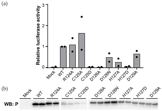 In order to assess the involvement of the β-strand twist motif in BoDV-1 replication, we performed minireplicon assays using a series of P mutants, each one bearing a single amino acid substitution at the twist or in its proximal regions (from position 124 to 129). 293T cells were then transfected with a minigenome plasmid containing the Gaussia luciferase as a reporter gene, together with plasmids encoding for N, L, and different versions of P. The Gaussia luciferase activity levels were then measured (Figure 3a). Correct expression of each P mutant was confirmed by western blotting (Figure 3b). Interestingly, substitutions by alanine of R124 and D129, two proximal residues of the motif, did not affect the polymerase activity. Rather, the activity was abolished or markedly reduced by mutating C125, D126, or H127. Note that the quantity of protein for this mutant, as well as for the second mutant tested for this position (i.e., C125D), appeared strongly reduced in the western blot analysis. Altogether, these results suggest that the β-strand twist motif is important for BoDV-1 replication, notably concerning D126 and H127 residues, whereas C125 would have an effect on the stability and/or the folding of P. Cysteine residues are known to form disulfide bridges and stabilise the structuration of secreted proteins. Surprisingly for a nuclear protein, such a disulfide bridge has been previously proposed at position 125 of BoDV-1 P [90]. Our experimental conditions did not allow us to detect them, especially in the crystal structure. However, compared to D126, which is strictly conserved (Figure 4j and Figure S8), the amino acid in position 125 is a cysteine only in mammalian 1 orthobornaviruses (i.e., BoDV-1 and -2).