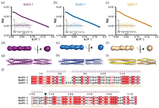 Structural analysis of orthobornaviral POD. Experimental SAXS diffusion curves (with residuals (small plots)) of (a) BoDV-1, (b) MuBV-1, and (c) GaVV-1 POD overlaid with the averaged SAXS curves (black) resulting from the ab initio models shown in panels d–f. Low-resolution envelops of (d) BoDV-1, (e) MuBV-1, and (f) GaVV-1 POD based on the ab initio modelling from the SAXS data. X-ray structure of (g) BoDV-1, (h) MuBV-1, and (i) GaVV-1 POD with the same orientation (i.e., N-terminal on the left). The SAXS envelops (d–f) and the X-ray structures (g–i) are not at the same scale. Figure S4 presents the dockings of the X-ray structures in the SAXS envelops. (j) Sequence alignment of the corresponding POD with the secondary structures of BoDV-1 and GaVV-1, shown above and below the sequence alignment, respectively. Residues in a solid red background are identical between the three sequences. The green triangle indicates the position of the conserved aspartate residue within the β-strand twist motif.