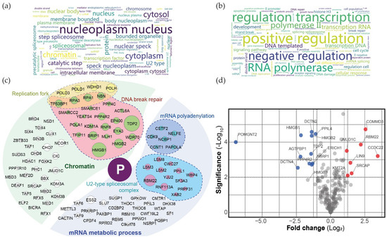 Proximal interactomes of PFULL in human cells. Word clouds of Gene Ontology enrichment analysis (https://toppgene.cchmc.org/; accessed on 1 September 2022) of Cellular Component (a) and Biological Process (b) (assembled on http://www.bioinformatics.com.cn/plot_basic_wordcloud_118_en; accessed on 1 September 2022). (c) Illustration of a subset of PFULL high-confidence interactors. Proteins are grouped and coloured by selected functions or compartments, as indicated on the diagram; node diameter is proportional to the Log2 fold change against control. (d) Volcano plot comparing the N- and C-terminal BirA* tagged BioID data. Blue and red dots represent N- and C-terminal BirA* tagged preferential partners, respectively (p-value < 0.01 and Log2 fold change > 1 between both fusions). Assembled using https://huygens.science.uva.nl/VolcaNoseR/; accessed on 1 September 2022). All data are based on three biological replicates and have been filtered for background against a set of 20 control runs (see Methods and Supplemental Methods for details).