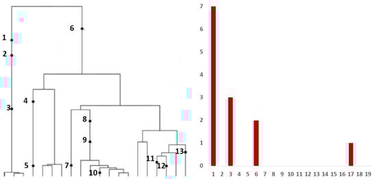Left panel: genealogy of a sample of genomes including 13 mutational events, denoted by black dots. Mutations 4, 5, 7, 10, 11, 12 and 13 (total of 7 mutations) are present in a single genome, mutations 1, 2 and 3 (total of 3 mutations) are present in three genomes, mutations 8 and 9 (2 mutations) are present in six genomes and mutation 6 (1 mutation) is present in 17 genomes. Right panel: the observed site frequency spectrum (SFS), , , and , other equal to 0.