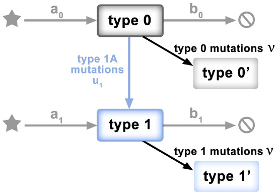 Schematic of the model of [23,33]. Clonal expansion begins with a single genome of the ancestral individual (Type 0). Type 0 individuals grow at rate . Neutral mutations accumulate at rate . Type 0 individuals mutate to Type 1 at rate . Type 1 individuals grow at rate , where .