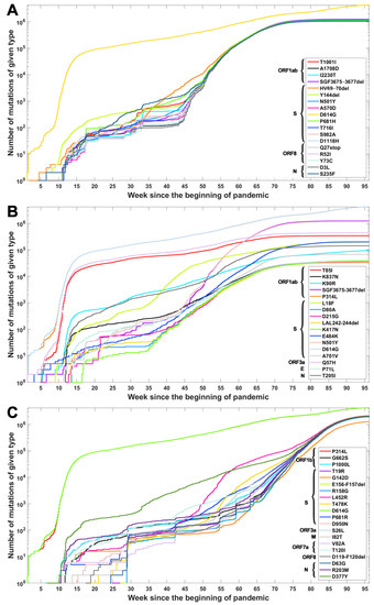 Cumulative count of genomes with variant of concern-defining (VOC-defining) mutations over time. Each curve depicts the number of genomes with given mutation that occurred up to a specified week. Mutations are listed in the same order as in Table A1, Table A2 and Table A3. (A) B.1.1.7 (Alpha) variant; (B) B.1.351 (Beta) variant; (C) B.1.617.2 (Delta) variant.