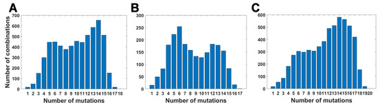 Number of unique subsets of VOC-defining mutations for a given mutation count. (A) B.1.1.7 (Alpha) variant; (B) B.1.351 (Beta) variant; (C) B.1.617.2 (Delta) variant.