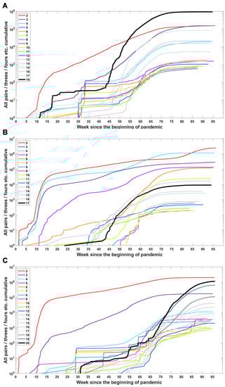 Accumulation of subsets of a given number of variant-defining mutations over time. Sets containing all VOC-defining mutations are marked by a thick black line. (A) B.1.1.7 (Alpha) variant; (B) B.1.351 (Beta) variant; (C) B.1.617.2 (Delta) variant.