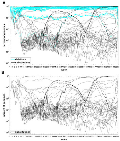 Sites which do not belong to any of the three categories are not counted. The three-way categorization is carried out for all genomes ascertained during a given week, so we obtain a series of snapshots of frequencies of mutations at all sites at which such mutations were recorded. These are not “trajectories” in the real sense, however, they allow tracking evolution of the viral genomes. Inclusion of the “N” category leads to puzzling results. Therefore, for now, we limit ourselves to substitutions and deletions and return to the “N”’s later on.