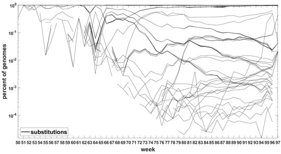 In an attempt to understand the dynamics of the genomic evolution of the VOC of SARS-CoV-2, we carried out a longitudinal analysis of almost all mutations recorded in the GISAID genomes from week 1 through week 97 of the pandemic. The findings are described in the current section. Here, we are concerned with the “upper portion” of the mutation frequency range. This is why we ordered the almost 30,000 mutations at almost all genomic sites by the maximum relative frequency they have over the 97 week period we tackled. We chose 1000 sites ranking the highest with respect to this metric. In this way, we concentrate on sites at which the variants even transiently exceeded an admittedly neutral drift boundary and are likely to play a role in selection for or against the VOC. In the next sections, we focus on the lower and middle parts of the range.
