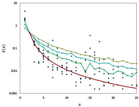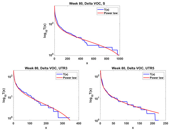 Griffiths and Pakes’ [35] process is a modification of the standard Bienayme–Galton–Watson branching process to allow individuals infinitely many possible identifiable types. In our application, the types are alleles (variants) of the SARS-CoV-2 genomic sequence identified by specific point mutations. From time , a non-mutant clone of genomes is evolving in discrete time according to a single-type branching process with probability per time step, a particle mutates and initiates a clone of a new previously non-existent type, which evolves according to the same rules as the original non-mutant clone. As a result, a set of clones of different types emerges, spawning further clones, some of which may die out. Kimmel and Matthaes [36] derived, using Griffith–Pakes’ theory, expected frequencies of allele classes such that an allele is in class k if it exists in k copies for a specific version of the process (further on).