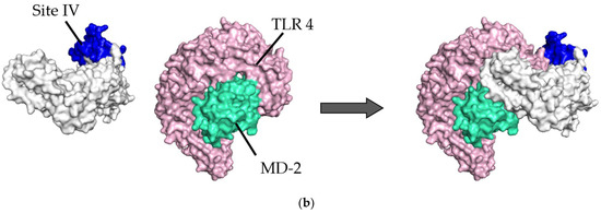 - To validate the docking simulation, the docking models generated by HDOCK were rescored using HawkDock and PPI-Affinity. As shown in Table 1(a,b), the top five ranked docking models for the prefusion protein were all models in which sites II and IV were designated as the binding site. Thus, the best-scored models in sites II and IV were determined as the optimal models in the present docking simulation, respectively. The rank of the selected model in site II was first, twenty-seventh, and nineth, and in site IV, second, eighth, and tenth, based on the HDOCK, HawkDock, and PPI-Affinity scores, respectively, in 120 docking models. Similarly, in postfusion proteins, the optimal models were ranked and selected from among the top 20 docking models based on the HDOCK, HawkDock, and PPI-Affinity scores-site II: first, third, and third, respectively; site IV: first, third, and third, respectively. To understand the 3D structures of the F proteins (prefusion/postfusion) and TLR4/MD-2 complex easily, the natural structures are illustrated in Figure 1.