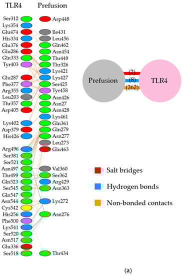 Next, in the site IV-associated prefusion protein/TLR4/MD-2 complex model, the prefusion protein interacted with TLR4 through five hydrogen bonds, no salt bridge, and 197 non-bonded contacts and with MD-2 through 21 non-bonded interactions (Figure 2b and Figure 3b). At site IV of the prefusion proteins, there were no hydrogen bond non-salt bridges connected to the TLR4 molecule. In this docking complex model, the predicted binding affinity between prefusion proteins and TLR4/MD-2 complexes was −12.9 kcal/mol (Table 3). In the docking complex models in which site IV was designated as the binding site, the number of ICs between the prefusion proteins and TLR4/MD-2 was as follows: charged/charged, 7; charged/apolar, 29; polar/polar, 13; and polar/apolar, 25. The %NIC values for apolar and charged elements were 33.91% and 24.68%, respectively. In addition, the 3D structural models and intermolecular interactions between the TLR4/MD-2 complex and the prefusion protein in the best-scoring models of other antigenic sites (Ø, I, III, and V) are shown in Figures S1 and S2.