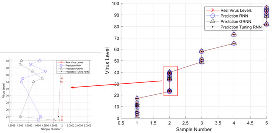 The prediction of virus levels is based on RNN, GRNN, and tuning RNN in comparison to the real data.