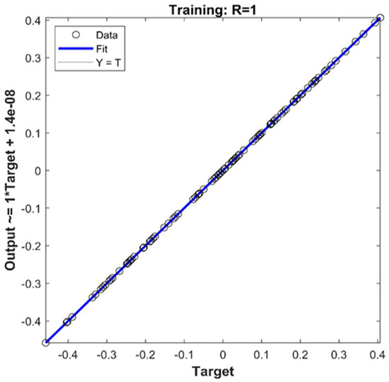 Figure 10 represents a performance assessment plot that shows the progress of the training. There was no evidence of overfitting. Furthermore, it indicated a similar tendency in the behavior of the training curves, which is expected given that the raw data were normalized before use. A lower mean square error determines the training accuracy of a network. An error score of 3.216 × 10−11 at epoch 639 indicates a network with a high ability to anticipate virus levels.