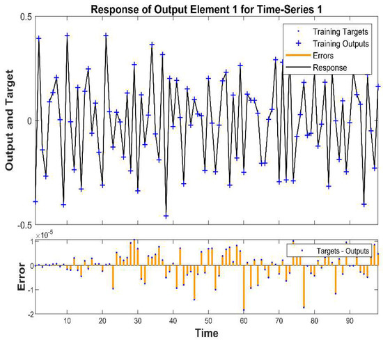 The plot target and output time-series data of the network training response are used to show the results of virus predictions in the training stages. The time-series response is where the output is the prediction, and the goal refers to accurate data in the three stages of training and the error related to the data, as shown in Figure 9. Plots were used to compare the observed (target) values with the model’s predicted (output) values over time to evaluate the model’s performance and anticipate how well it would fare in the future concerning the forecast and the incidence of the virus at various levels. The process errors were also analyzed by plotting them against time. The model can reflect and mimic the desired output and does an excellent job of capturing the general trend at various levels of incidence. Furthermore, the estimation errors versus time range were −2 to 1 × 10−5, and the output and target response were between −0.5 and 0.5, which concluded that this was the best model to use.