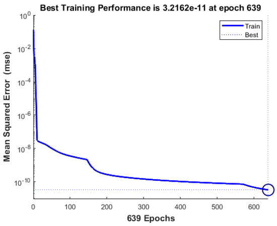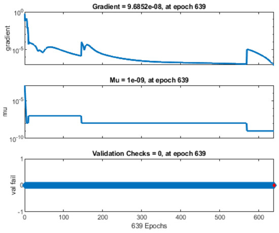 In the backpropagation process after a batch of data training, the neural networks estimate the error contribution of each neuron. Technically, the neural network computes the loss function’s gradient to explain each chosen neuron’s error contribution. The gradient value of 9.6852 × 10−8, as shown in Figure 11, demonstrates that the error contribution of each selected neuron is small. Momentum gain (Mu) is a control parameter for the neural network training process and was 1 × 10−9 at epoch 639. In addition, the following figure shows the training state, including the gradient function, the training gain (Mu), and the validation check.