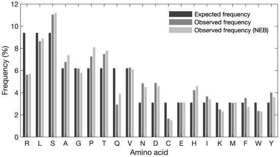 29]. Our observations were in concordance with the manufacturer’s data with some minor discrepancies (such as lower overrepresentation of A and P as well as higher underrepresentation of Q). This concordance also holds true for S which has the highest frequency and C which has the lowest frequency in both our and NEB data (