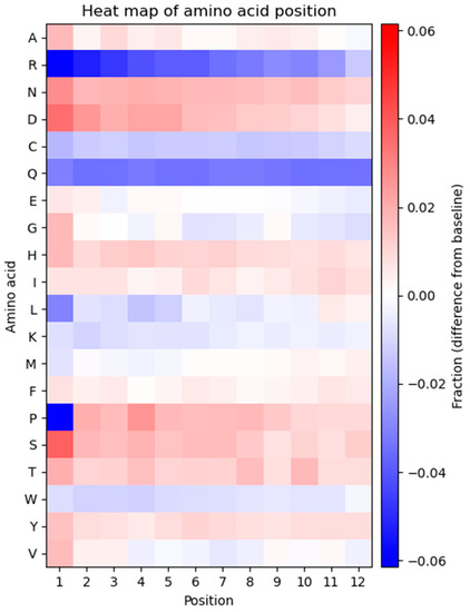 As displayed in the heatmap, the positional frequency of some amino acids is not consistent across all residues, and several positional biases can be observed. A general trend of the heatmap is that every amino acid displays one type of bias, either overrepresentation or underrepresentation in every position. The only exceptions are glycine, proline, and valine which show a combination of over- and underrepresented amino acids at different positions. Arginine and glutamine exhibit underrepresentation compared to the expected frequency and exhibit considerable bias in most positions. Proline is strongly underrepresented at position one. Aspartic acid and serine are overrepresented in multiple positions. Several residues (alanine, asparagine, glycine, histidine, leucine, lysine, methionine, threonine, tryptophan, and tyrosine) show variations across all 12 positions in the peptide. Glutamic acid, isoleucine, and phenylalanine exhibit a fixed pattern of amino acid positional distribution across all residues.