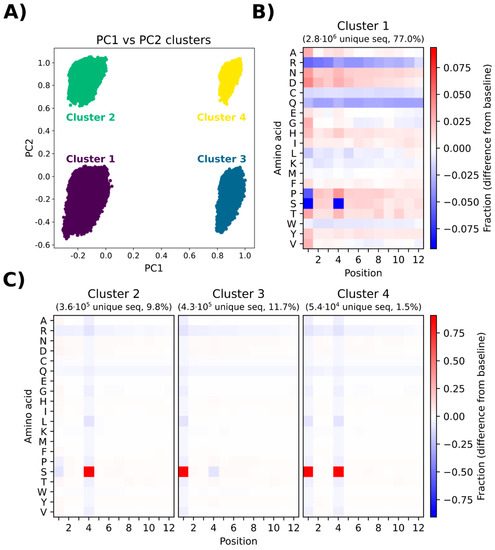 Figure 6) provided evidence for a substantial heterogeneity and non-random distribution of peptides in the naïve library. PCA indicated the formation of four distinct clusters, mainly distinguished by underrepresentation or overrepresentation of S in positions 1 and 4 within the 12-mer peptide (