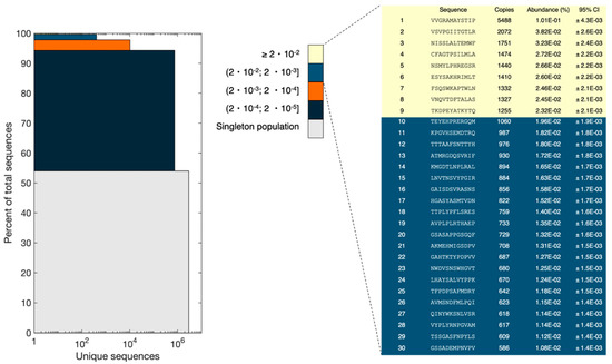 21]. For the sequences only observed once (singleton population), the sum of abundances was 54% of the total pool (corresponding to 2,927,839 reads), which is the biggest population in the pool of sequences. The sum of abundances of the most frequent sequences (frequency ≥ 0.02%) comprised 0.3% of the population. However, the most frequent peptide had a frequency of 0.1% and 5488 copies. Several peptides had more than 500 copies. Assuming a binomial distribution of the subsampling of the phage pool, the probability of observing one clone once in our experimental setup would be 0.0054 (5,418,602 reads and 10