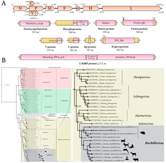 Genomic architecture and phylogenetic insights of Ratón oliváceo morbillivirus. (A) Genome graphs depicting architecture and predicted gene products of RoMV. The predicted coding sequences are shown in orange arrow rectangles; start and end coordinates are indicated. Gene products are depicted in curved yellow rectangles and size in aa and name are indicated below. Predicted domains or HHP red best-hit regions are shown in curved pink rectangles. Abbreviations: N, nucleoprotein CDS; P, phosphoprotein CDS; M, Matrix protein CDS; F, Fusion protein CDS; HP, hypothetical protein CDS; H, Hemagglutinin glycoprotein CDS; L, RNA-dependent RNA-polymerase CDS; TM, trans-membrane domain; SP, signal peptide; LS, leaky scanning; mRNA-e, RNA editing. Domain abbreviations are described in the main text. (B) Maximum likelihood phylogenetic tree based on amino acid alignments of the L polymerase of RoMV and members of accepted species within family Paramyxoviridae. The right panel represents an inset of the complete phylogenetic tree that is available as Supplementary Figure S9. The tree is rooted at Sunshine coast virus (family Sunviridae). The scale bar indicates the number of substitutions per site. Node labels indicate FastTree support values. Silhouettes represent natural hosts. Genbank accession numbers of the proteins used are depicted before each virus species name. * indicates RoMV.