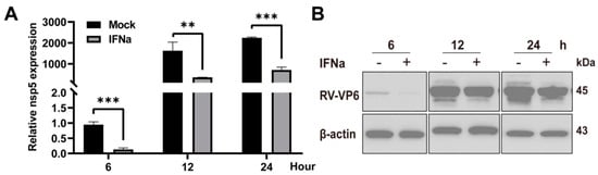The effects of type I IFN on RV strain Wa were investigated by preincubating Caco2 cells with IFNa2b (Biolegend, San Diego, CA, USA) for 12 h. This was followed by RV infection for a certain time. As shown in the RT–qPCR results, Wa infection was significantly limited by IFNa2b (5000 U/mL), and the inhibitory effect of IFNa2b treatment group reached more than eight times that of the mock group at 6 h after viral infection. (Figure 1A). Western blot results also showed that IFNa2b restricted and delayed RV replication, especially in the early stage of RV infection, because the RV–VP6 protein band in the IFNa2b treated group was invisible for the first 6 h (Figure 1B).