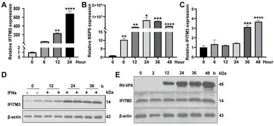 IFNa2b and RV promote the expression of IFITM3. (A) RT–qPCR analysis of IFITM3 in Caco2 cells after being incubated with IFNa2b (5000 U/mL) for the indicated time. (B) RT–qPCR analysis of the strain Wa–NSP5 in Caco2 cells infected with the strain Wa at 0.2 MOI for the indicated time. (C) RT–qPCR analysis of IFITM3 in Caco2 cells infected with the strain Wa at 0.2 MOI for the indicated time. (D) Western blot analysis of IFITM3 in Caco2 cells after being incubated with IFNa2b (5000 U/mL) for the indicated time. (E) Western blot analysis of the strain Wa–VP6 and IFITM3 in Caco2 cells infected with the Wa strain at 0.2 MOI for certain time (A–C) Results represented the mean ± SD and were measured in technical duplicates, n = 3. *, p < 0.05; **, p < 0.01; ***, p < 0.001 and ****, p < 0.0001 (Student’s t test).