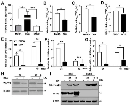 In order to evaluate the role of IFITM3 in RV infection, MDCK–Tet3G–IFITM3 cells stably over–expressing IFITM3 were previously generated based on the Tet–On 3G system []. MDCK–Tet3G–IFITM3 cells were cultured in DMEM for 24 h, DMEM containing Dox or DMSO, respectively. IFITM3 was tested by RT–qPCR and Western blot. Results indicated that DMSO almost had no influence on the mRNA of IFITM3, and DOX significantly stimulated IFITM3 expression (Figure 3A). Western blot showed that IFITM3 was higher in Dox–treated cells than DMSO–treated cells (There is very low background IFITM3 expression in MDCK–Tet3G–IFITM3 cells, to the point of being invisible) (Figure 3I). Thereafter, MDCK–Tet3G–IFITM3 cells were infected with different RV strains at 0.2 MOI for 24 h and 48 h, and VP6 were examined by RT–qPCR. This indicated that MDCK–Tet3G–IFITM3 cells induced by Dox significantly limited the infection of MSLH14 strain, Wa strain and SA11 strain (Figure 3E–G). Next, viral titers were measured by TCID50, and the results showed that there were significant decreases in titers for different strains of RV in Dox–treated MDCK–Tet3G–IFITM3 cells (Figure 3B–D). Furthermore, Wa–VP6 and MSLH14–VP6 were further evaluated by Western blot after infection. A lower VP6 was observed in Dox–treated cells than in DMSO–treated cells (Figure 3H,I). Therefore, these results showed that IFITM3 inhibited infection of different RV strains.