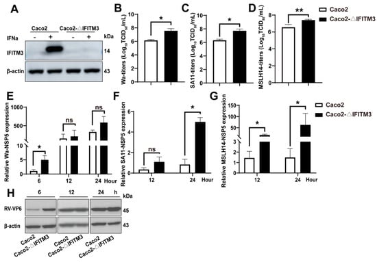 Knockout of IFITM3 enhances RV replication in Caco2 cells. (A) Western blot analysis of IFITM3 in Caco2 and Caco2–ΔIFITM3 cells with or without IFNa2b pre–treatment. (B–D) Infectious progeny viral titers in Caco2 and Caco2–ΔIFITM3 cells. The viral titers of the Wa strain, SA11 strain and MSLH14 strain were determined by TCID50. (E–G) RT–qPCR analysis of Wa–NSP5 in Caco2 and Caco2–ΔIFITM3 cells infected with the Wa strain, SA11 strain and MSLH14 strain, respectively, at 0.2 MOI for the indicated time. (H) Western blot analysis of Wa–VP6 in Caco2 and Caco2–ΔIFITM3 cells after being infected with the Wa strain. (B–G) Results represented the mean ± SD and were measured in technical duplicates, n = 3. ns, p > 0.05; *, p < 0.05; **, p < 0.01 (Student’s t test).