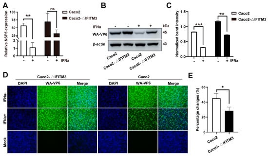 Knockout of IFITM3 attenuates the IFN–induced anti–RV activity. (A) RT–qPCR analysis of Wa–NSP5 in Caco2 and Caco2–ΔIFITM3 cells that were, respectively, infected with the Wa strain at 0.2 MOI for 24 h after IFNa2b treatment for 12 h. (B) Western blot analysis of Wa–VP6 in Caco2 and Caco2–ΔIFITM3 cells infected with the Wa strain, respectively, at 0.2 MOI for 24 h after IFNa2b treatment for 12 h. (C) Bands analysis from panel B were quantified using ImageJ software and normalized to the reference genes β–actin. (D) Immunofluorescence analysis (40×) of Wa strain infection for 24 h in Caco2 and Caco2–ΔIFITM3 cells after IFNa2b treatment for 12 h. (E) Declined percentages of infected cells in Caco2 and Caco2–ΔIFITM3 cells after IFNa2b treatment. (A,C,E) Results represented the mean ± SD and were measured in technical duplicates, n = 3. ns, p > 0.05; *, p < 0.05; **, p < 0.01; ***, p <0.001 (Student’s t test).