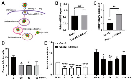 Next, in order to determine in which stage IFITM3 restricts RV infection, it was hypothesized that IFITM3 would act in the virion disassembly stage on endosomes and not at the stage of receptor recognition and target cell binding. The assay was carried out as follows in Figure 6A. Caco2 or Caco2–ΔIFITM3 cells were adsorbed with the Wa strain at 5 MOI at 4 °C for 1 h, and then binding viruses were detected by Wa–NSP5 using RT–qPCR. Results showed that no differences were observed in infected cells in the presence or absence of IFITM3 (Figure 6B). After binding, cells were incubated for another 1 h at 37 °C, and mRNA of Wa–NSP5 was detected. As results indicated, there were more infections in Caco2–ΔIFITM3 than that in Caco2 cells by roughly two–fold (Figure 6C).