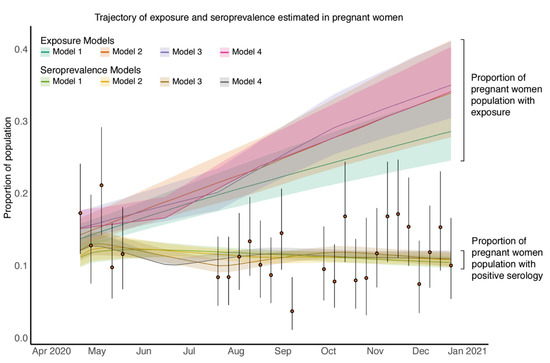 The estimated seroprevalence (proportion of pregnant patients who are seropositive) from each of the dynamic models (Figure 3) match that of our data (Figure 2B–D). We next estimated the exposure to SARS-CoV-2 in the pregnant patients and found that exposure is estimated to be much higher than serology positivity (Figure 3). Due to the rapid decline in antibody levels after natural infection confirmed in both experimental analyses [27,28,29] and modelling analyses [11,12], there is a gap between seropositivity and the cumulative level of exposure; furthermore, this gap increases with time due to increasing exposure levels over time (Figure 3).