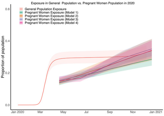 We next compared cumulative level of exposure among pregnant patients with of the general population of New York City from the same time period. In brief, the levels of exposure in general population were estimated by applying our previously published inference methodology [11] to the epidemic data including mortality and seroprevalence in general population of New York City (model fitting and parameter estimation results for the general population can be found in Figure S1 and Table S2 respectively). The level of exposure in pregnant patients during April and May of 2020 is estimated to be around half of that in December 2020 in all four models (Figure 3 and Figure 4). This means that the exposure estimates of pregnant patients approaches that of the general population by November and December of 2020 (Figure 4).