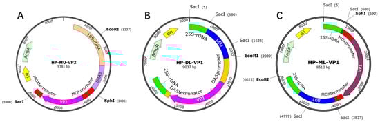 Schematic structures of the constructed VP2, VP1 and VP1h plasmids. (A): The constructed VP2 plasmid (HP-MU). (B): The constructed VP1 plasmid (HP-DL). (C): The constructed VP1h plasmid (HP-ML).