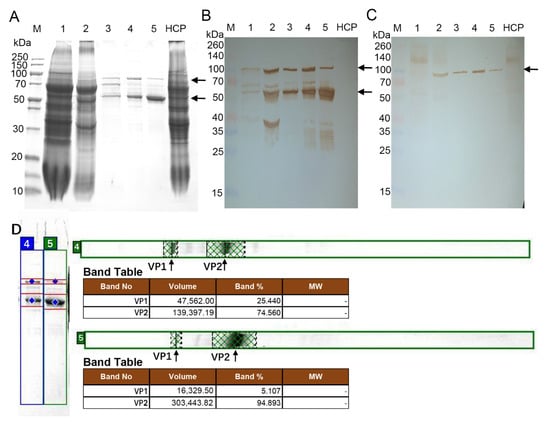 SDS-PAGE and Western blot analysis results of the VP1/VP2 and VP1h/VP2 VLPs recombinantly expressed by using the Hansenula polymorpha yeast. (A): SDS-PAGE of the VP1/VP2 and VP1h/VP2 VLPs. (B): Western blot analysis of the VP1/VP2 and VP1h/VP2 VLPs in which the anti-parvovirus B19 5E408 monoclonal antibody was used. (C): Western blot analysis of the VP1/VP2 and VP1h/VP2 VLPs in which the anti-VP1u polyclonal antibodies were used. (D): Gray scanning results for the relative contents of VP1 and VP2 in the VP1/VP2 and VP1h/VP2 VLPs by using the ImageQuant TL software. M: marker; Lane 1: whole-cell lysate proteins of the Hansenula polymorpha expressing VP1h/VP2 VLP; Lane 2: VP1h/VP2 VLP sample after crude purification by two-aqueous phase extraction; Lane 3: VP1h/VP2 VLP sample after purification using the gel column chromatography; Lane 4: VP1h/VP2 VLP after further purification using the anionic-exchange chromatography; Lane 5: VP1/VP2 VLP after gel column chromatography and anionic-exchange chromatography purifications; HCP: host cell proteins. The bands corresponding to the VP1 and VP2 proteins were marked by black arrows.