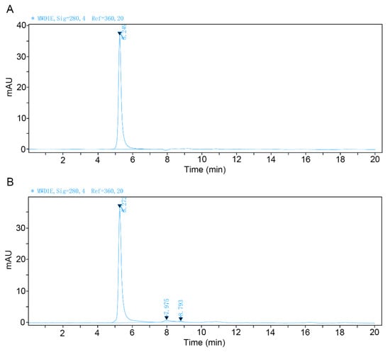 The purity of these two recombinant VLPs, i.e., VP1/VP2 and VP1h/VP2 VLPs, was analyzed by the SEC-HPLC method. The experimental results are shown in Figure 3. It was found that the purity of both VLPs is higher than 95%.