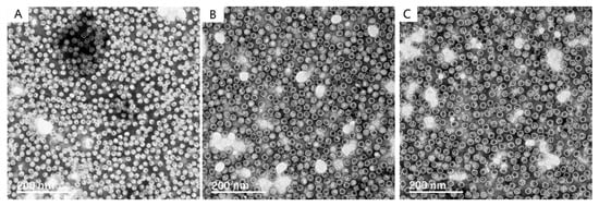 Morphological observation of the recombinant VP1/VP2 and VP1h/VP2 VLPs by using negative staining transmission electron microscopy (TEM), which was compared with that of the VP2 VLP produced by using the same Hansenula polymorpha expression system in our previous study [25]. (A): The TEM micrograph of the VP2 VLPs. This TEM graph was taken by the same sample but in a slightly different scope, with permission from Ref. [25] published by Chinese Journal of Microbiology and Immunology, 2020. (B): The TEM micrograph of the VP1/VP2 VLPs. (C): the TEM micrograph of the VP1h/VP2 VLPs.
