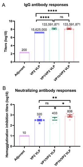 The immunogenicity of the recombinant VP1/VP2 and VP1h/VP2 VLPs was evaluated and compared with that of the VP2 VLP produced previously by our laboratory using the same expression system. For each recombinant VLP, 6 BALB/c female mice were immunized and the serum was collected. Then, the titer of IgG antibodies in the sera was measured by using ELISA, and furthermore the titer of neutralizing antibodies was evaluated by using HI assay. The ELISA results show that both the VP1/VP2 and VP1h/VP2 VLPs elicit a high level of IgG antibodies, as displayed in Figure 5A. There is no statistical difference in the geometric mean titers (GMTs) of IgG antibodies between these two recombinant VLPs. However, the IgG antibody GMTs induced by the VP1/VP2 and VP1/VP2 VLPs are significantly higher than that elicited by the VP2 VLP, as shown in Figure 5A, which demonstrates that VP1 plays an important role for the immunogenicity of the recombinant VLPs.