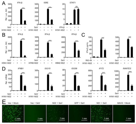 It is well known that during the viral replication cycle, NS2 acts as an adaptor to mediate the export of viral ribonucleoproteins (vRNPs) from the nucleus to the cytoplasm [,,]. Nevertheless, little is known about the role of NS2 in the process of viral escape from host antiviral innate immunity. In this study, we sought to explore the role of NS2 in virus-triggered IFN-Ξ² activation. As shown in Figure 1A, overexpressed H1N1-NS2 strongly inhibited SeV-triggered activation of the IFN-Ξ² promoter and ISRE, but NS2 had no inhibitory effects on the IFN-Ξ²-triggered activation of STAT1-luciferase reporter, which contains STAT1 response element. Consistently, overexpressed NS2 from different IAV subtypes strongly inhibited SeV-triggered activation of the IFN-Ξ² promoter (Figure 1B). Furthermore, H1N1-NS2 significantly inhibited the production of IFN-Ξ² triggered by overexpressed RIG-IN and SeV infection (Figure 1C). Quantitative PCR (qPCR) analysis indicated that overexpression of NS2 significantly inhibited SeV-triggered transcription of the interferon beta 1 (IFNB1), IFN-stimulated gene 15 (ISG15), IFN-stimulated gene 56 (ISG56), interferon-induced protein with tetratricopeptide repeats 2 (IFIT2), and regulated upon activation normal T cell expressed and secreted factor (RANTES) genes in A549 cells (Figure 1D). Since NS2 inhibited virus-triggered induction of downstream effector genes, we next investigated whether NS2 plays a role in the cellular antiviral response. As shown in Figure 1E, supernatants from SeV-infected and MAVS-overexpressed cells completely inhibit the replication of GFP-expressing vesicular stomatitis virus (VSV-GFP) in fresh cells as monitored by GFP fluorescent intensity, while NS2- and NS1-transfected cells stimulated with SeV could not completely inhibit the replication of VSV-GFP, suggesting that NS2 dampened the secretion of antiviral factors induced by SeV. Taken together, these data suggested that the NS2 protein of IAV inhibits the induction of IFN-I.
