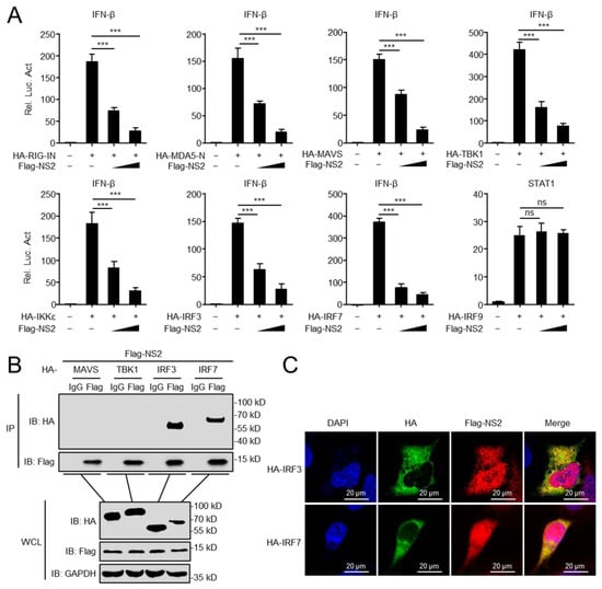 NS2 interacts with IRF3 and IRF7. (A) NS2 inhibits activation of the IFN-Ξ² promoter induced by RIG-IN, MDA5-Card, MAVS, TBK1, IKKΞ΅, IRF3, and IRF7. HEK293 cells were transfected with indicated plasmids along with increasing amounts (0, 200 ng, and 400 ng/mL) of Flag-NS2 expression plasmids. The activation of STAT1-luciferase triggered by IRF9 was used as a negative control. Reporter assays were performed 24 h after transfection. (B) Overexpressed NS2 interacts with IRF3 and IRF7. HEK293 cells were transfected with indicated plasmids for 24 h. Then, Co-IP and immunoblotting analyses were performed using indicated antibodies. (C) NS2 co-localizes with IRF3 and IRF7 in the cytoplasm. U2OS cells were transfected with Flag-NS2 and HA-IRF3/IRF7 plasmid for 24 h, and then stained with Flag antibody or HA antibody and secondary antibodies. Nuclei were counter-stained with DAPI. Scale bar, 20 ΞΌm. The data shown represent three independent experiments (p < 0.05 (*), p < 0.01 (**), p < 0.001 (***), βnsβ indicates no significant difference).