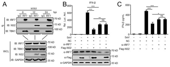 Liu et al. has reported that histone H1C regulates IFN-I production by interacting with IRF3, and NS2 reduces H1C-IRF3 interaction to inhibit the H1C-enhanced IFN-Ξ² expression []. Considering this, we started to investigate the role of IRF7 in the NS2-regulated IFN-I expression. Following H1N1 virus infection, endogenous Co-IP experiment verified that NS2 was associated with IRF7 in the infected cells, with TBK1 as a positive control to interact with IRF7 (Figure 3A). Luciferase and ELISA assays indicated that overexpression of NS2 significantly inhibits SeV-mediated activation of the IFN-Ξ² promoter and the induction of IFN-Ξ², but in cells transfected with siRNA of IRF7, NS2 could not inhibit the activation of the IFN-Ξ² promoter and the production of IFN-Ξ² (Figure 3B,C). Collectively, the data revealed that IRF7 is another specific target of NS2 to inhibit the IFN-I induction.