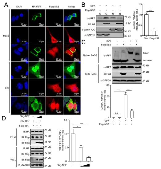 Viral infection leads to IRF7 activation and translocation into the nucleus, where it binds to the promoter regions of interferon gene to activate the transcription []. We then examined the possibility that NS2 alters the ability of IRF7 to enter the nucleus. As shown in Figure 4A, the NS2 localized in both nucleus and cytoplasm, and the IRF7 localized largely in the cytoplasm of mock-treated cells. Following SeV stimulation, IRF7 translocated into nucleus, but the expression of NS2 prevented the nuclear translocation of IRF7. Using subcellular fraction isolation, we further analyzed the expression of IRF7 in cytoplasmic and nuclear fractions, and detected that NS2 reduces the expression of IRF7 in the nucleus of SeV-treated cells (Figure 4B). Using native-PAGE to analyze the dimerization of IRF7, we found that SeV treatment promotes the formation of IRF7 dimers, and overexpressed NS2 significantly inhibited the dimerization of IRF7. As a verification, we co-transfected an increasing amount of NS2 together with HA- and Flag-tagged IRF7 and performed Co-IP assays. We found that Flag-NS2 interacts with HA-IRF7, and dose-dependently inhibits the interaction between HA-IRF7 and Flag-IRF7, which indicated that NS2 bound to HA-IRF7 in competition with Flag-IRF7 in a dose-dependent manner. Together, these results suggested that NS2 influences the formation of IRF7 dimers by competing with IRF7, and further blocks the nuclear translocation of IRF7.